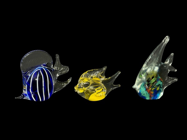 • ESCULTURAS, lote com três (3) esculturas representando peixes confeccionadas em vidro de Murano de tonalidades e formatos distintos, maior medindo 11,5x11cm e menor 6x9,5cm.