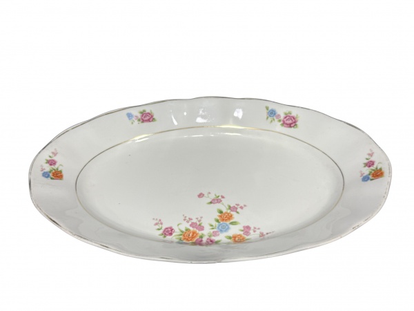 • PORCELANA REAL, uma (1) grande travessa oval confeccionada em porcelana nacional na tonalidade branca, decorada por flores e folhagens em policromia e filetes em ouro, apresentando falhas na douração medindo 45x29cm.