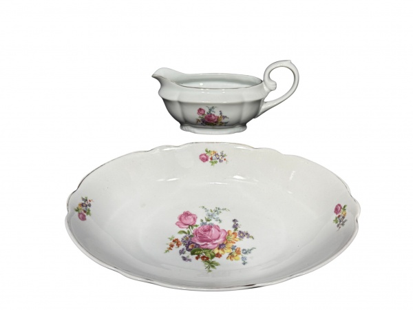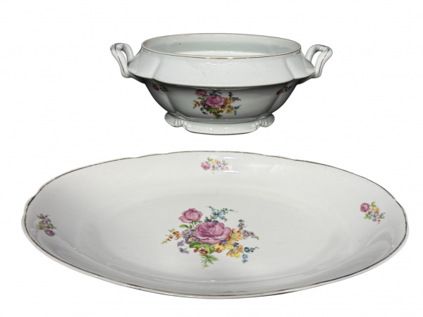 • PORCELANA REAL, duas (2) peças, sendo: A) 1 molheira, medindo 10x21x11,5cm e B) 1 travessa funda, medindo 6x28,5x20,5cm, confeccionadas em porcelana nacional na tonalidade branca, decorada por flores e folhagens em policromia e filetes em ouro, apresentando falhas na douração.