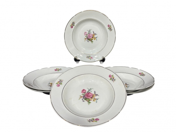 • PORCELANA REAL, seis (6) pratos fundos confeccionados em porcelana nacional na tonalidade branca, decorada por flores e folhagens em policromia e filetes em ouro, apresentando falhas na douração medindo 23,5cm.