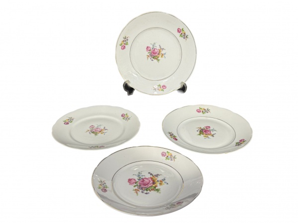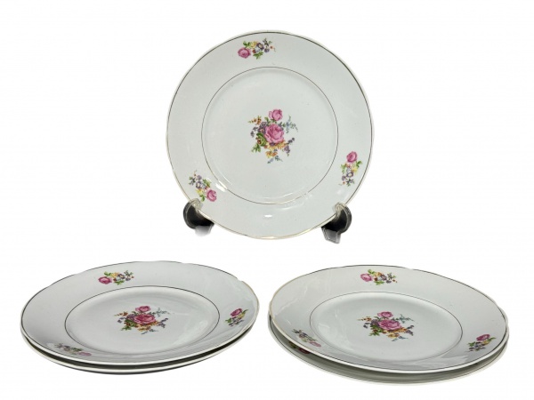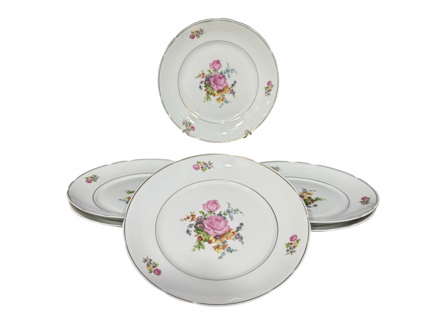 • PORCELANA REAL, cinco (5) pratos para sobremesa confeccionados em porcelana nacional na tonalidade branca, decorada por flores e folhagens em policromia e filetes em ouro, apresentando falhas na douração medindo 18,5cm.
