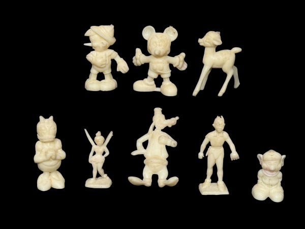 • COLECIONISMO, nove (9) figuras confeccionadas em material sintético de tonalidade clara, representando personagens clássicos do universo Disney, incluindo figuras humanas, infantis/cartoon e animal, em diferentes posturas e tamanhos. Peças de pequeno porte, com modelagem simples, típicas de produção colecionável e decorativa do séc. XX, maior medindo 5cm e menor 3cm.