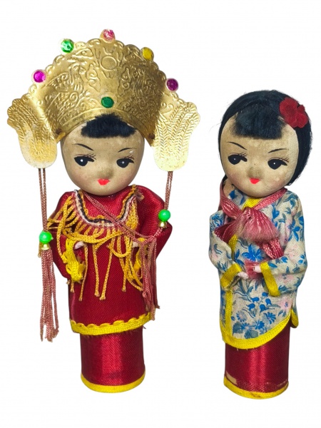 • ARTESANATO ORIENTAL, par (2) de bonecas decorativas orientais em tecido e material misto, com trajes tradicionais e detalhes aplicados. Medidas : 17 e 14 cm/s