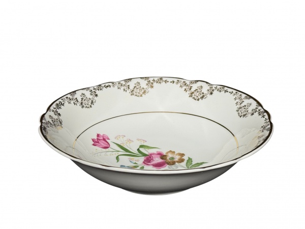• PORCELANA REAL, uma (1) saladeira confeccionada em porcelana nacional na tonalidade branca, decorado por flores e folhagens em policromia e borda em guirlanda floral e filetes em vasta douração, medindo 6,5x24cm.