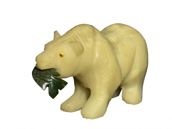 • ESCULTURA, uma (1) escultura confeccionada em pedra clara, possivelmente ágata, representando urso com folha na boca, medindo 6,5x11cm.
