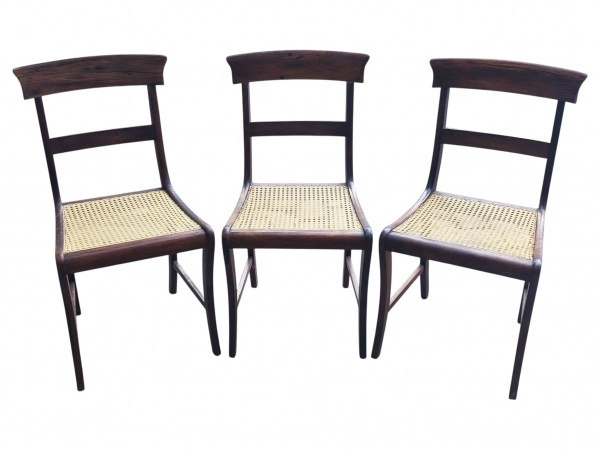 • MOBILIARIO, três (3) cadeiras, confeccionadas em madeira, apresentando assento em palhinha natural trançada. Estrutura de linhas simples e elegantes, com encosto reto, travessa horizontal e pés levemente afunilados, conferindo visual clássico e atemporal, típico de mobiliário de meados do século XX. As cadeiras mantêm boa estabilidade estrutural, uma apresenta fissura na parte traseira, vide foto, medindo 88x46x47cm.