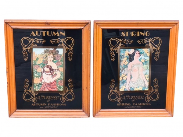 • QUADROS, dois (2) quadros com fundo em vidro preto, apresentando composições de estética Art Nouveau, com figuras femininas alegóricas representando as estações Autumn (Outono) e Spring (Primavera). As imagens, inspiradas em ilustrações clássicas do início do século XX, são aplicadas sobre fundo em vidro preto espelhado, com rica ornamentação gráfica em dourado, conferindo profundidade visual e forte apelo decorativo. Peças emolduradas em madeira, com acabamento envernizado, medindo 42x35cm.