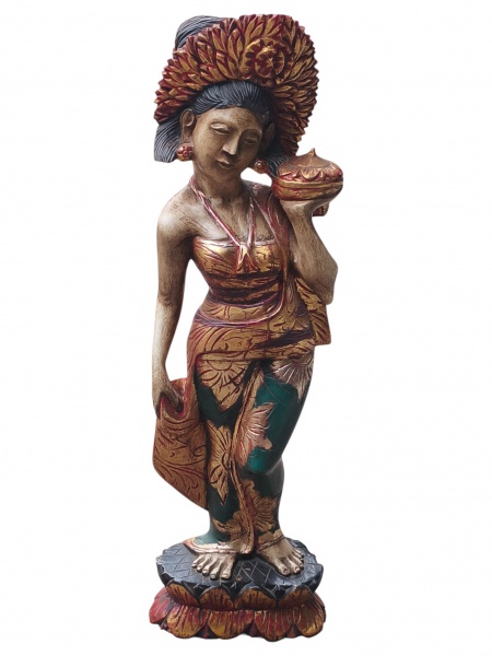 • ESCULTURA, uma (1) escultura confeccionada em madeira entalhada a mão representando balinesa, trajando vestes tradicionais ricamente ornamentadas. A personagem apresenta postura graciosa, com expressão serena, portando pequeno recipiente ritualístico, com cocar elaborado em relevo floral, conferindo forte apelo estético e cultural à peça. Escultura confeccionada em resina, com acabamento policromado, medindo 64cm de altura.