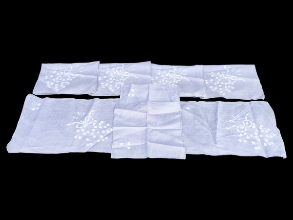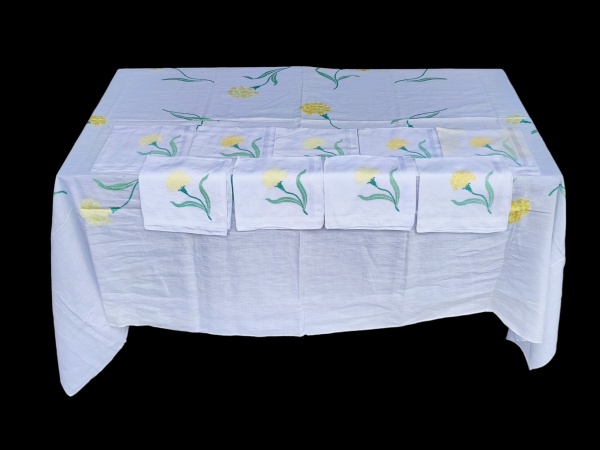 • CAMA, MESA & BANHO, conjunto composto por uma (1) toalha de mesa e dez (10) guardanapos, confeccionados em tecido na tonalidade branca, decorados com bordados florais representando flores em tons de amarelo e verde, distribuídos de forma harmoniosa, toalha medindo 206x142cm e guardanapos 41x41cm. Apresenta pequeno furo e leves manchas de guardado.