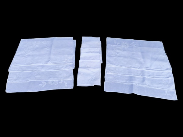 • CAMA, MESA & BANHO, conjunto composto por uma (1) toalha de mesa em tecido branco e dez (10) guardanapos, confeccionados em linho, apresentando bordados florais em relevo distribuídos pelo campo da peça. A toalha possui borda recortada em ondas, com acabamento delicado e visual clássico, toalha medindo 240x160cm e guardanapos 37x37cm, levíssimas manchas de guardado.