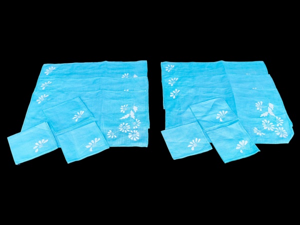 • CAMA, MESA & BANHO, jogo americano composto por seis (6) peças e seis (6) guardanapos, confeccionados em tecido na tonalidade azul, com bordados em relevo na cor branca, apresentando motivos florais estilizados distribuídos pelo campo das peças, jogo 49x30cm e guardanapos 27,5x27,5cm.