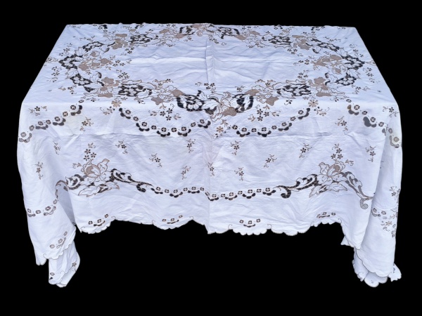 • ILHA DA MADEIRA, uma (1) toalha de mesa da ILHA DA MADEIRA confeccionada em linho na tonalidade branca com bordado Richelieu em linha bege escuro, medindo 264x176cm, levíssimas manchas de guardado e furo na ponta.