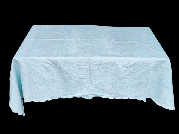 • CAMA, MESA & BANHO, uma (1) toalha de mesa em tecido, na tonalidade verde, apresentando padronagem floral e arabescos em relevo por toda a superfície, possui borda recortada em ondas, acabamento delicado e visual clássico, manchas de guardado, medindo 192x140cm.