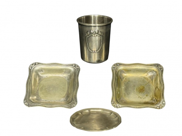 • METAL PRATEADO, quatro (4) peças confeccionadas em metal espessurado a prata de modelos, tamanhos e decorações distintas, sendo: A) 1 copo infantil com leves mossas, medindo 6,5x5,5cm, B) 2 manteigueiras individuais, medindo 8x8cm e C) 1 porta copo, medindo 7cm.