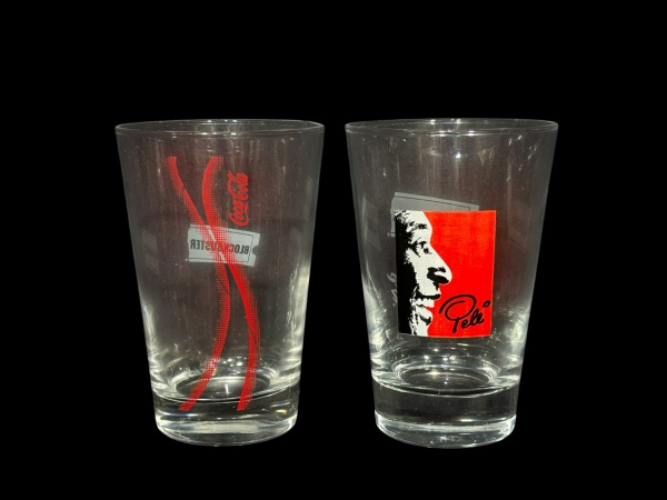 • VIDROS, dois (2) copos para água confeccionados em vidro translucido com estampas promocionais das marcas Coca-Cola e Blockbuster, incluindo variações gráficas com logotipo, grafismos e imagem do Pelé. Peças associadas a campanhas promocionais e memorabilia publicitária, medindo 12,5x8cm.