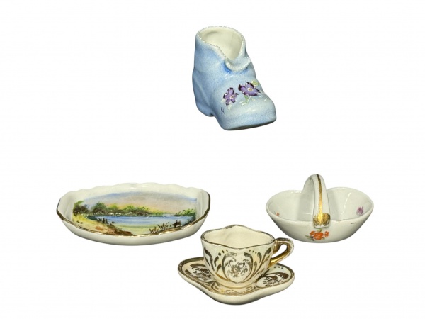 • PORCELANAS, lote com quatro (4) peças em miniatura confeccionadas em porcelana de modelos, tamanhos e decorações distintas, sendo: A) 1 cinzeiro no feitio de sapato, medindo 6x9cm, B) 1 pequena travessa decorativa, medindo 10x7cm, C) 1 pequena cesta, medindo 4x7x4,5cm (bicado na borda) e D) 1 xícara com seu respectivo pires, marcado L, possivelmente Limoges, medindo 3x5x3cm.