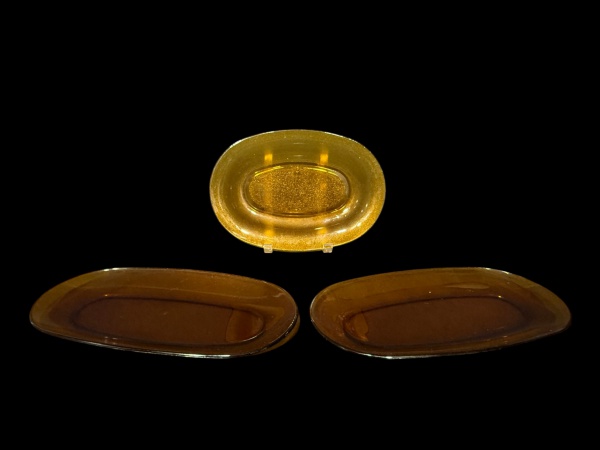 • VIDROS, três (3) travessas ovais confeccionadas em vidro na tonalidade âmbar, sendo: A) 2 da manufatura DURALEX, medindo 36x18,5cm, 1 bicada na borda e B) 1 da manufatura NADIR, medindo 27,5x19cm.