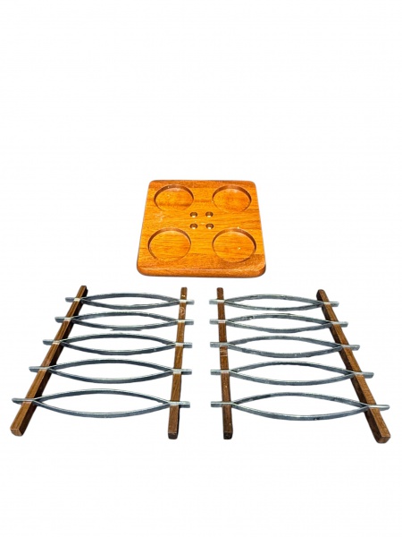 • DIVERSOS, lote com três (3) peças, sendo: A) 1 petisqueira com quatro divisórias confeccionada em madeira, medindo 22,5x22,5cm e B) 2 descansos para pirex em aço inox da manufatura HERCULES, com estrutura em madeira, medindo 23x19,5cm.