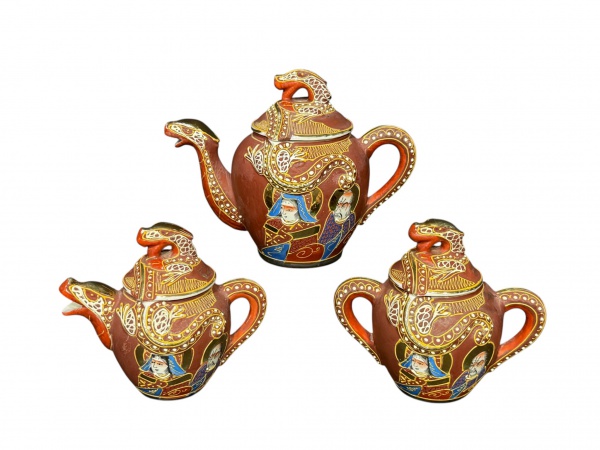 • PORCELANA SATZUMA, parte de serviço para chá, sendo: A) 1 bule para chá, medindo 15,5x19x8cm, B) 1 leiteira com tampa, medindo 11,5x13,5x6cm e C) 1 açucareiro, medindo 12x13,5x6cm, confeccionadas em porcelana oriental na tonalidade branca com esmaltagem na tonalidade marrom, decorada por figuras Arhats/Deidades, personagens da mitologia e folclore asiático que simbolizam boa sorte e felicidade, esmaltados em policromia com realces em ouro.