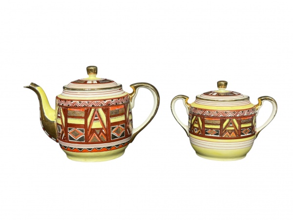 • PORCELANA NADIR, duas (2) peças, sendo: A) 1 bule para chá, medindo 14x20x9cm e B) 1 açucareiro, medindo 11,5x15,5x8cm, confeccionados em porcelana nacional na tonalidade branca com decoração de elementos geométricos em rica policromia com realces em ouro, apresentando falhas na douração.