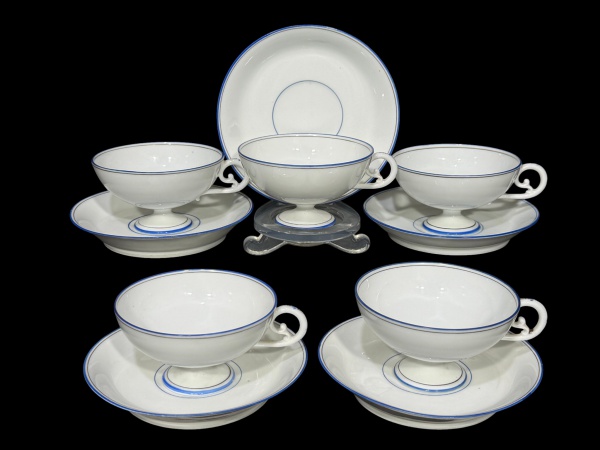 • Jean Pouyat (A família Pouyat esteve envolvida na porcelana desde o século XVIII em Limoges, França), cinco (5) xícaras para chá com seus respectivos pires confeccionadas em fina porcelana francesa na tonalidade branca decorada por filetes na tonalidade azul, medindo 5x11x9,5cm.1 píres com ímperceptível bicado.