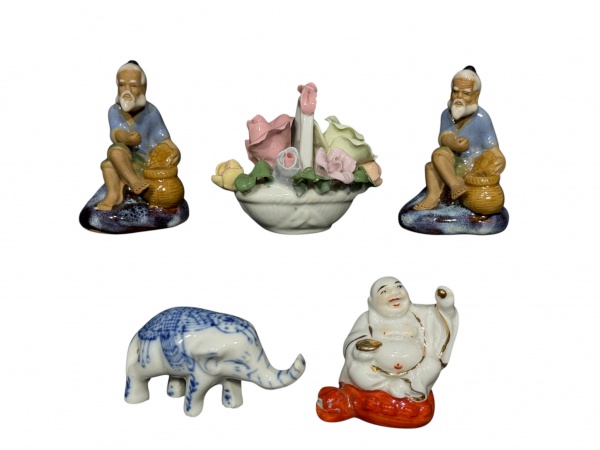 • ESCULTURAS, lote com cinco (5) esculturas de modelos, tamanhos, decorações e materiais distintos, sendo: A) 2 pescadores orientais em cerâmica esmaltada em policromia, ausência da vara de pesca, medindo 8cm, B) 1 buda feliz em porcelana branca, medindo 5,5cm, C) 1 elefante em porcelana branca, medindo 4x7,5cm e D) 1 cesto de flores em porcelana, apresentando discretos bicados, medindo 6,5x8x6cm.