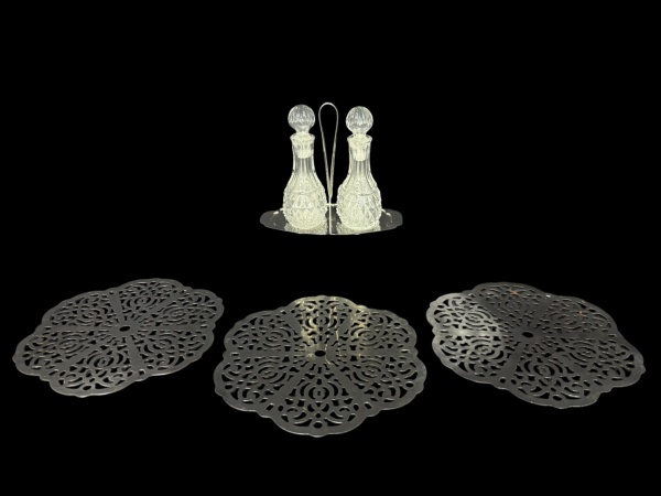 • METAL INOX, lote com quatro (4) peças, sendo: A) 3 descansos para pirex da manufatura EBERLE, decorado em vazados e bordas em recortes, medindo 22,5cm de diâmetro e B) 2 galhetas em vidro translucido com moldagem em bico de jaca, acoplada sobre suporte com alça central vazada e borda em recortes, galhetas medindo 16cm e base 17x20x12cm.