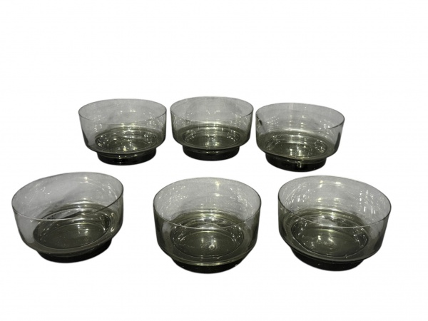 • VIDROS, seis (6) recipientes para sobremesa confeccionados em vidro na tonalidade fumê, medindo 9x12cm.