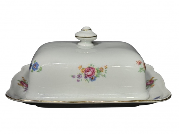 • KPM Krister Porzellan-Manufaktur (Fundada em 1831 por Carl Franz Krister), uma (1) manteigueira, confeccionada em porcelana polaca na tonalidade branca com pintura de flores e folhagens em policromia com filetes em ouro, medindo 8,5x17x14,5cm.