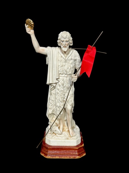 • ARTE SACRA, um (1) imaginário confeccionado em biscuit representando São João Batista com cruz metálica com mossas, segurando concha em douração, apoiada sobre base quadrangular em MDF com desgastes, medindo 33,5cm de altura.