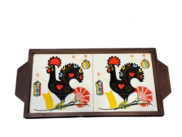 • DIVERSOS, uma (1) bandeja retangular confeccionada em madeira escura com incrustação de azulejos com pintura de Galos de Barcelos em policromia, medindo 37,5x17cm.