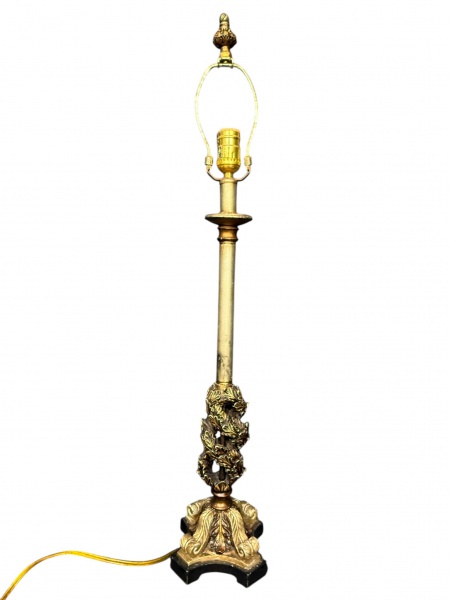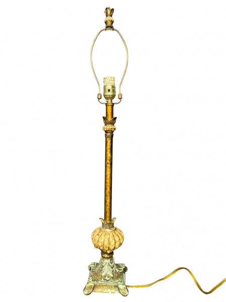 • ABAJUR, um (1) abajur para uma lâmpada confeccionado em resina, base quadrangular em recortes decorado em folhagens, parte superior em gomos, haste cilíndrica em metal c/ patina dourada e parte superior com trava no feitio de pinha, falhas na douração, medindo 80cm.