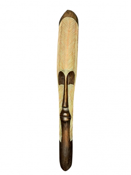 • ARTE AFRICANA, uma (1) máscara tribal com características que remetem à tradição da etnia Fang, originária da África Central, confeccionados em madeira entalhada a mão com entalhes de frisos patinados e partes escurecidas, apresentando imperceptíveis falhas na madeira, medindo 106x14cm, lascado na parte traseira.
