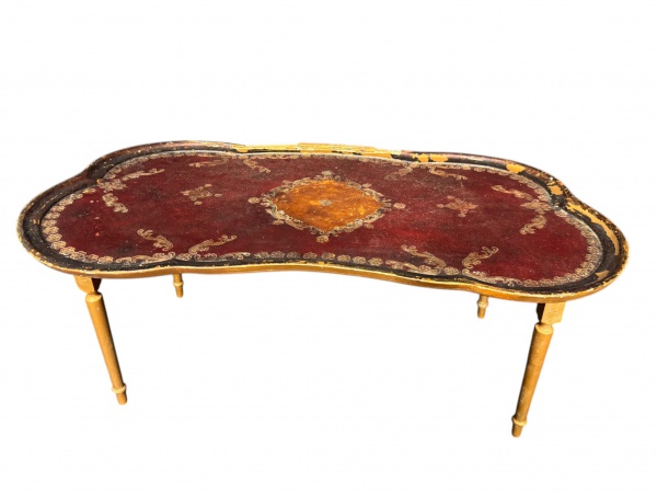 • DIVERSOS, uma (1) bandeja de servir confeccionada em madeira com patina na tonalidade vinho, decorado por elementos florais e vegetalista em relevo e douração, borda em recortes apresentando quebra, apoiada sobre 4 pés torneados e retrativos, medindo 29x72x38cm.