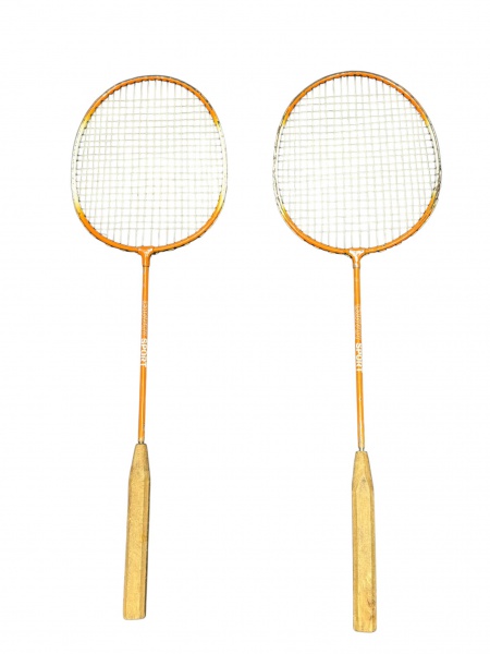• DIVERSOS, par (2) de raquetes de badminton confeccionado em metal esmaltado na tonalidade abóbora com pega em madeira, apresentando falhas na esmaltagem, medindo 65x20cm.