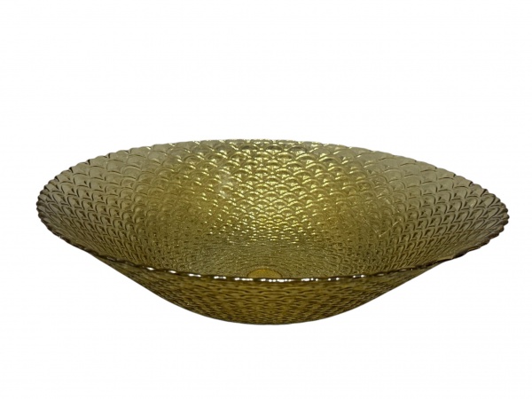 • VIDRO, uma (1) grande fruteira confeccionada em vidro na tonalidade âmbar moldada por arcos em baixo relevo e borda em ondulações, medindo 10x38cm.