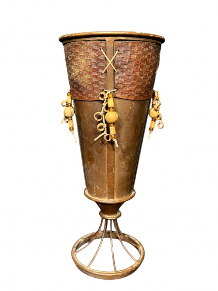 • MOBILIARIO, um (1) bengaleiro com estrutura em metal cobreado, decorado por faixa em couro na tonalidade marrom, decorado por pingentes sintéticos na tonalidade âmbar e em madeira, base cônica em vazados, medindo 50x21,5m.