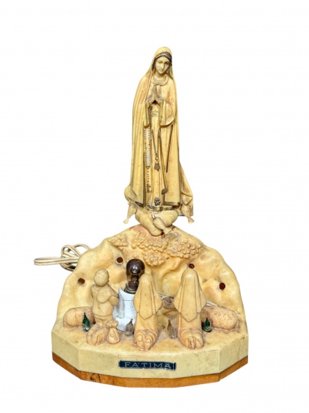 • ARTE SACRA, uma (1) luminária ou peça devocional representando Nossa Senhora de Fátima, em material sintético de coloração marfim, com imagem da santa sobre base cenográfica alusiva às aparições, com figuras de três (3) pastorinhos em oração, instalação elétrica e soquete para lâmpada, medindo 24cm de altura, quebra nos pés e nas lâmpadas, vendida no estado.