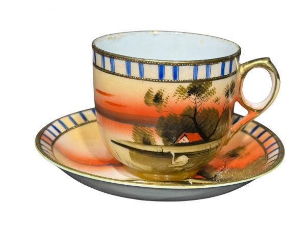 • PORCELANA ORIENTAL, uma (1) xícara de coleção para chá com seu respectivo pires confeccionado em porcelana oriental na tonalidade branca, pintada à mão com paisagem campestre, lago com cisne, árvores e construção ao fundo, policromia em tons de laranja, verde, azul e dourado, bordas e alça com filetes dourados. Peça de caráter decorativo e colecionável, típica de produções do início do século XX, medindo 7,5x10,5x8,5cm.