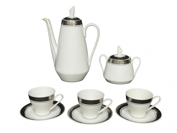 • PORCELANA STEATITA, cinco (5) peças, sendo: A) 1 bule para café, medindo 21x15cm (colado no bico), B) 1 açucareiro, medindo 10x12x6cm (colado na pega da tampa) e C) 3 xícaras para café com seus respectivos pires, medindo 5,5x8x6cm, confeccionados em porcelana na tonalidade branca, decorada por espessa faixa em prata com elementos geométricos.