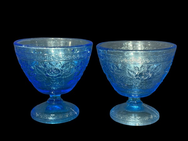 • VIDROS, par (2) de taças para sobremesa confeccionadas em vidro prensado na tonalidade azul, moldado por elementos florais, cachos de uva, folhas de parreira e borda em gregas, medindo 12x12cm.