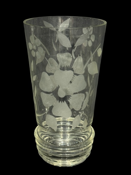 • VIDRO, um (1) vaso confeccionado em vidro translucido com decoração floral em tom fosco e base em gomos, medindo 22x12cm.