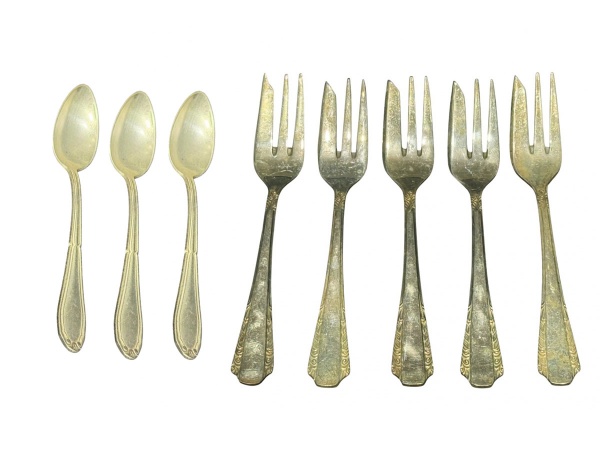 • METAL PRATEADO, lote com oito (8) peças confeccionadas em metal espessurado a prata, sendo: A) 5 garfos para bolo da manufatura WOLFF, cabo cinzelado por arabescos, e B) 3 colheres para café da manufatura EBERLE, cabo cinzlado por caneluras, finalizado por folhagens.