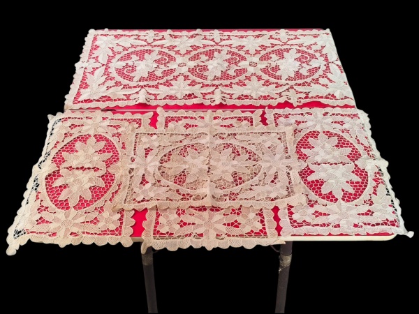 • CAMA, MESA & BANHO, lote com quatro (4) peças confeccionadas em renda veneziana na tonalidade marrom, decoração vazada de motivos florais e geométricos, sendo: A) 1 caminho de mesa, medindo 50x40cm e B) 4 panos de bandeja, medindo 40x27cm.