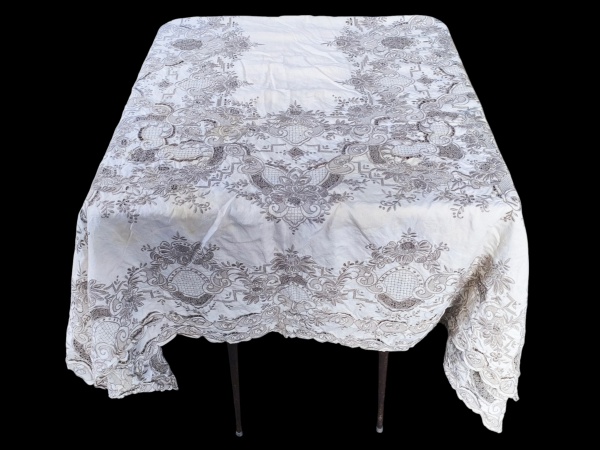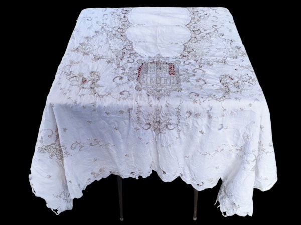 • CAMA, MESA & BANHO, uma (1) toalha de mesa retangular confeccionada em linho na tonalidade branca, com bordados em tom bege, apresentando rica decoração de motivos florais, volutas, reservas centrais ovais e uma catedral gótica estilizada, como a Notre-Dame de Paris, apresenta rasgos e manchas de guardado, medindo 320x310cm.