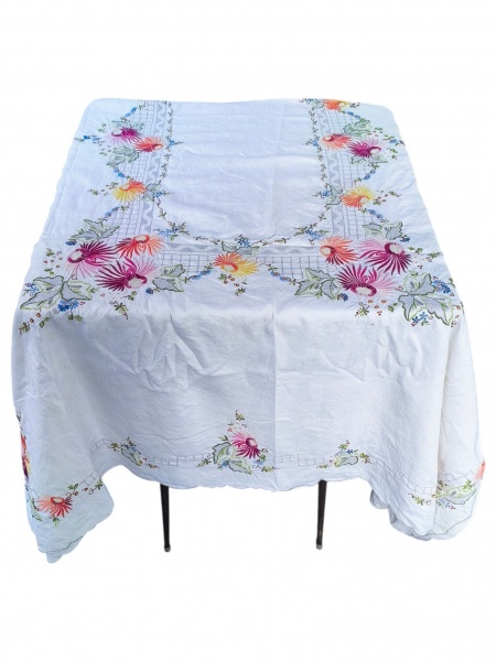 • CAMA, MESA & BANHO, uma (1) toalha de mesa quadrada confeccionada em tecido na tonalidade branca, decorada por módulos quadrados intercalados por trabalhos em rendas vazadas e borda em recortes, medindo 224x224