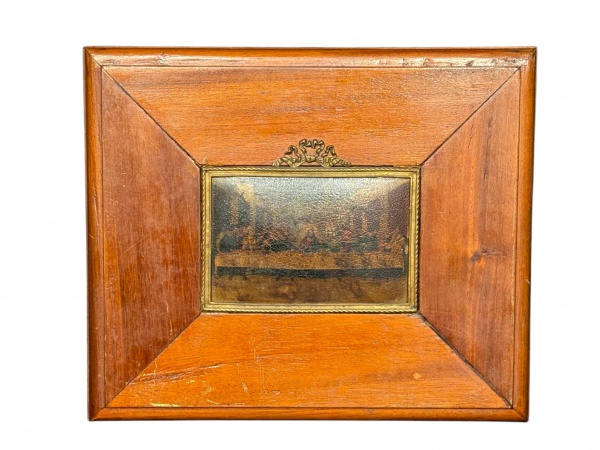 • ARTE SACRA, "Santa Ceia", pintura sobre couro, guarnecida em bronze cinzelado por laçarote em vazado sobre moldura em madeira, medindo 25,5x30cm e obra 8,5x13cm.