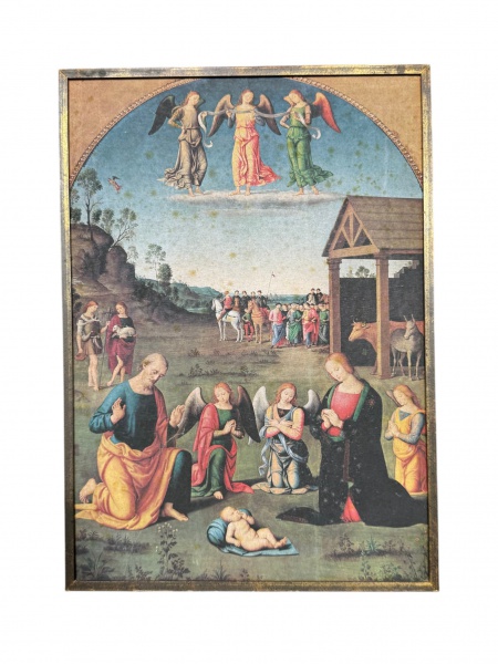 • ARTE SACRA, uma (1) reprodução colada sobre eucatex representando Natividade de Jesus (pintada por Giovanni di Pietro, conhecido como "Lo Spagna", entre 1507 e 1508), a cena mostra a Virgem Maria e São José adorando o Menino Jesus recém-nascido, com anjos presentes, a o fundo, observa-se a chegada dos Reis Magos, trazendo presentes ao local do nascimento, sinais de fungos e moldura em madeira escura, medindo 48x34cm.