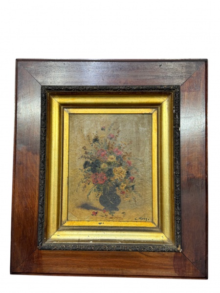 • ASSINATURA DESCONHECIDA, "Vaso de Flores", óleo sobre tela, moldura madeira com elementos vegetalistas em relevo, parte interna com patina dourada, apresentando falhas na patina, medindo 48x42,5cm e tela 24x19cm.