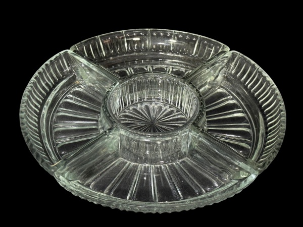 • VIDROS, uma (1) petisqueira com cinco divisórias confeccionadas em vidro translucido com moldagem de caneluras e fundo em gomos, ausência da bandeja que acoplava todas as peças, medida total 28,5cm de diâmetro.